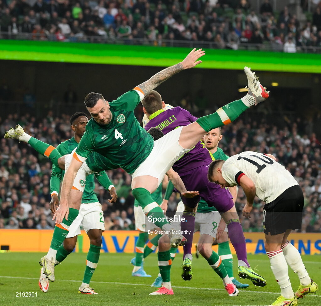 26 March 2022; Shane Duffy of Republic of Ireland after a collision with Thorgan Hazard of Belgium during the international friendly match between Republic of Ireland and Belgium at the Aviva Stadium in Dublin. Photo by Stephen McCarthy/Sportsfile