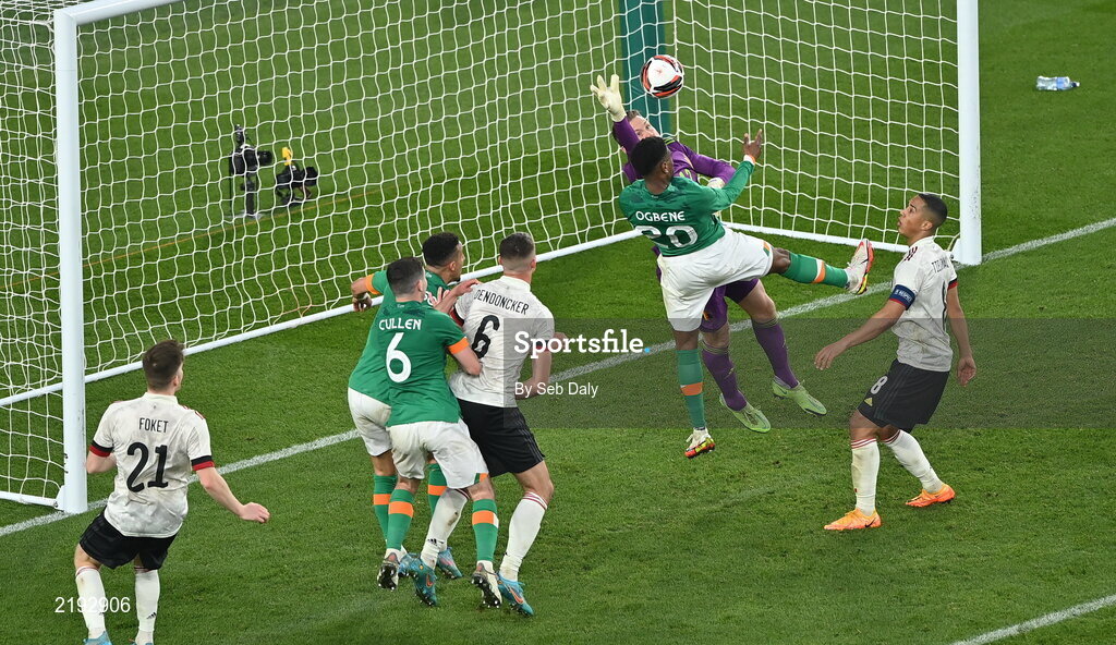 26 March 2022; Belgium goalkeeper Simon Mignolet and Chiedozie Ogbene of Republic of Ireland during the international friendly match between Republic of Ireland and Belgium at the Aviva Stadium in Dublin. Photo by Seb Daly/Sportsfile