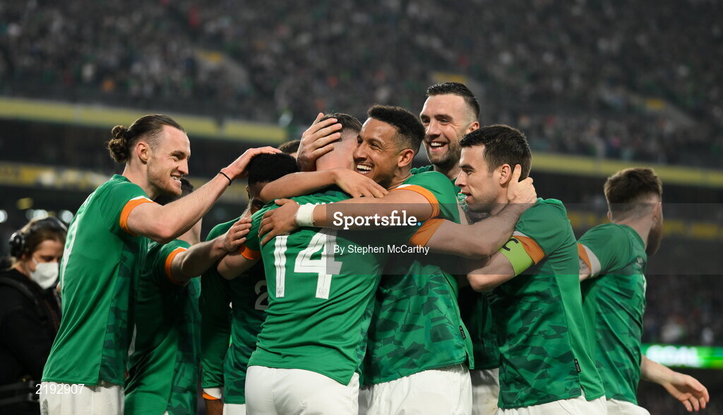 26 March 2022; Alan Browne of Republic of Ireland celebrates with teammates after scoring his side's second goal during the international friendly match between Republic of Ireland and Belgium at the Aviva Stadium in Dublin. Photo by Stephen McCarthy/Sportsfile
