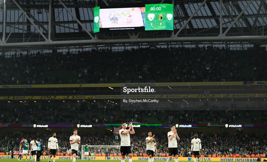 26 March 2022; Leander Dendocker of Belgium and teammates applaud supporters after the international friendly match between Republic of Ireland and Belgium at the Aviva Stadium in Dublin. Photo by Stephen McCarthy/Sportsfile