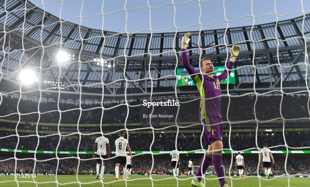 26 March 2022; Belgium goalkeeper Simon Mignolet reacts after conceding his side's second goal during the international friendly match between Republic of Ireland and Belgium at the Aviva Stadium in Dublin. Photo by Eóin Noonan/Sportsfile