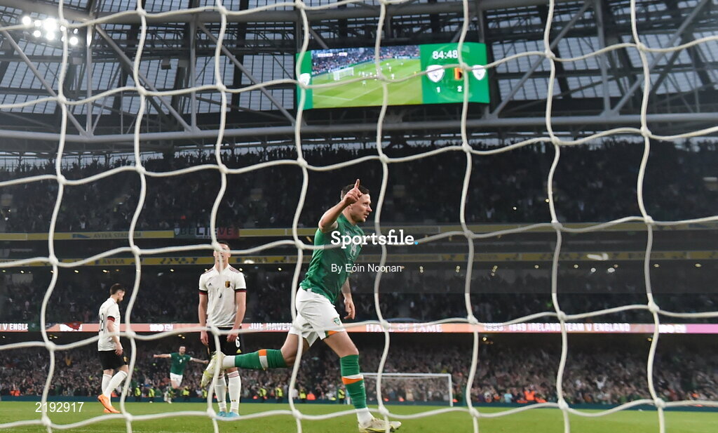 26 March 2022; Alan Browne of Republic of Ireland celebrates after scoring his side's second goal during the international friendly match between Republic of Ireland and Belgium at the Aviva Stadium in Dublin. Photo by Eóin Noonan/Sportsfile