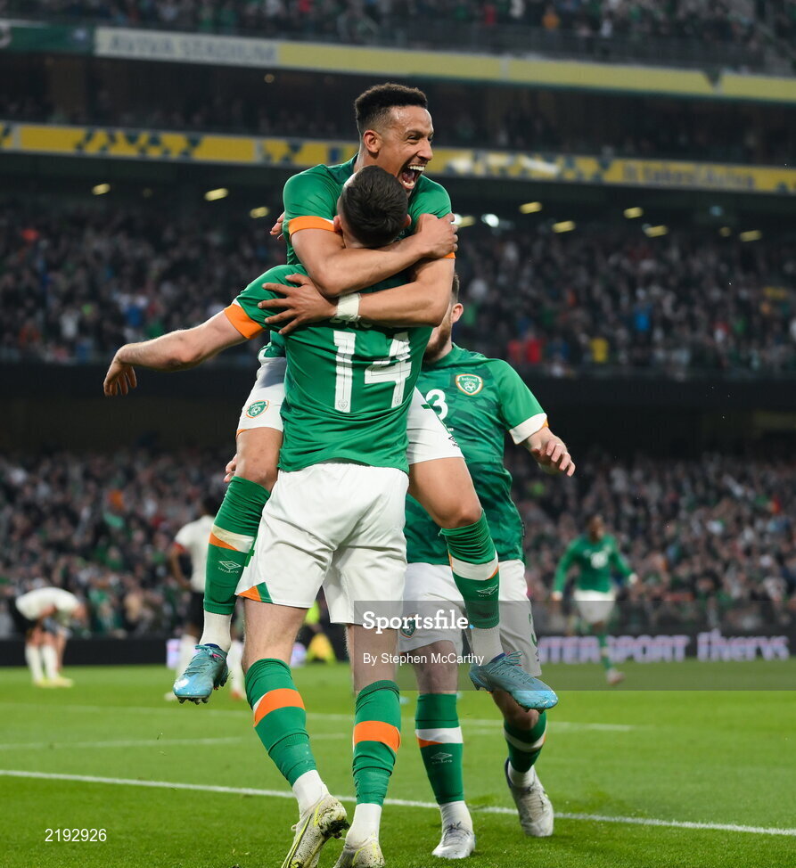26 March 2022; Alan Browne of Republic of Ireland, 14, celebrates with Callum Robinson, after scoring his side's second goal during the international friendly match between Republic of Ireland and Belgium at the Aviva Stadium in Dublin. Photo by Stephen McCarthy/Sportsfile