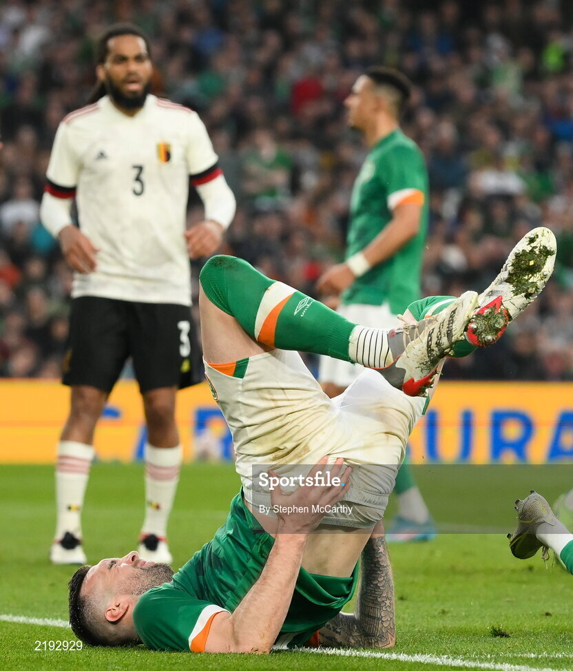 26 March 2022; Shane Duffy of Republic of Ireland reacts after a collision with Thorgan Hazard of Belgium during the international friendly match between Republic of Ireland and Belgium at the Aviva Stadium in Dublin. Photo by Stephen McCarthy/Sportsfile