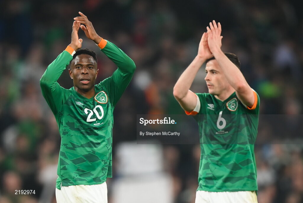 26 March 2022; Chiedozie Ogbene, left, and Josh Cullen of Republic of Ireland after the international friendly match between Republic of Ireland and Belgium at the Aviva Stadium in Dublin. Photo by Stephen McCarthy/Sportsfile