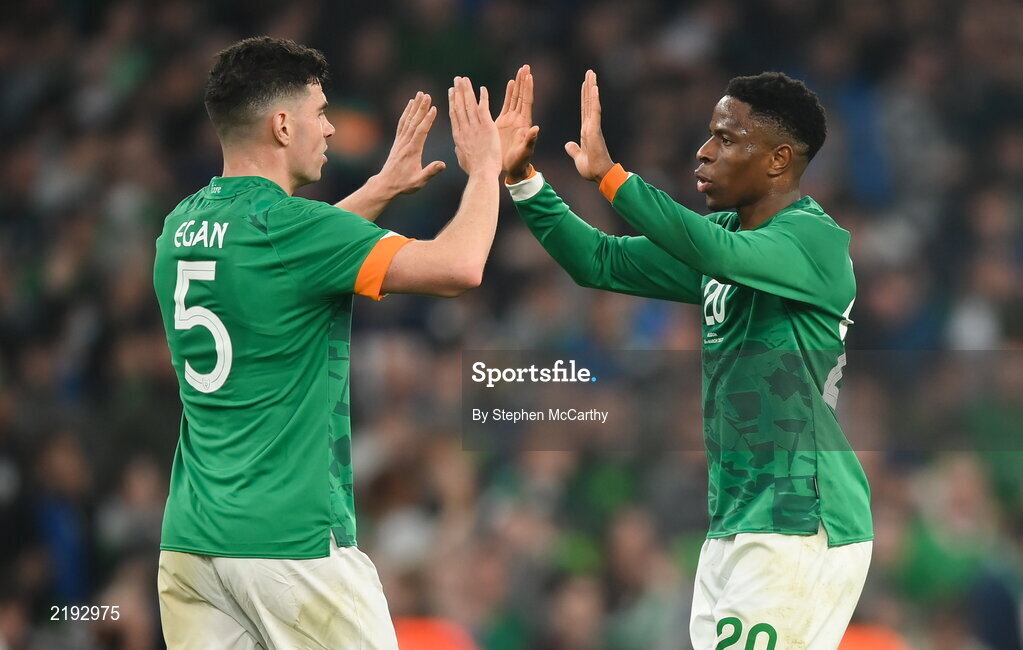 26 March 2022; John Egan, left, and Chiedozie Ogbene of Republic of Ireland after the international friendly match between Republic of Ireland and Belgium at the Aviva Stadium in Dublin. Photo by Stephen McCarthy/Sportsfile