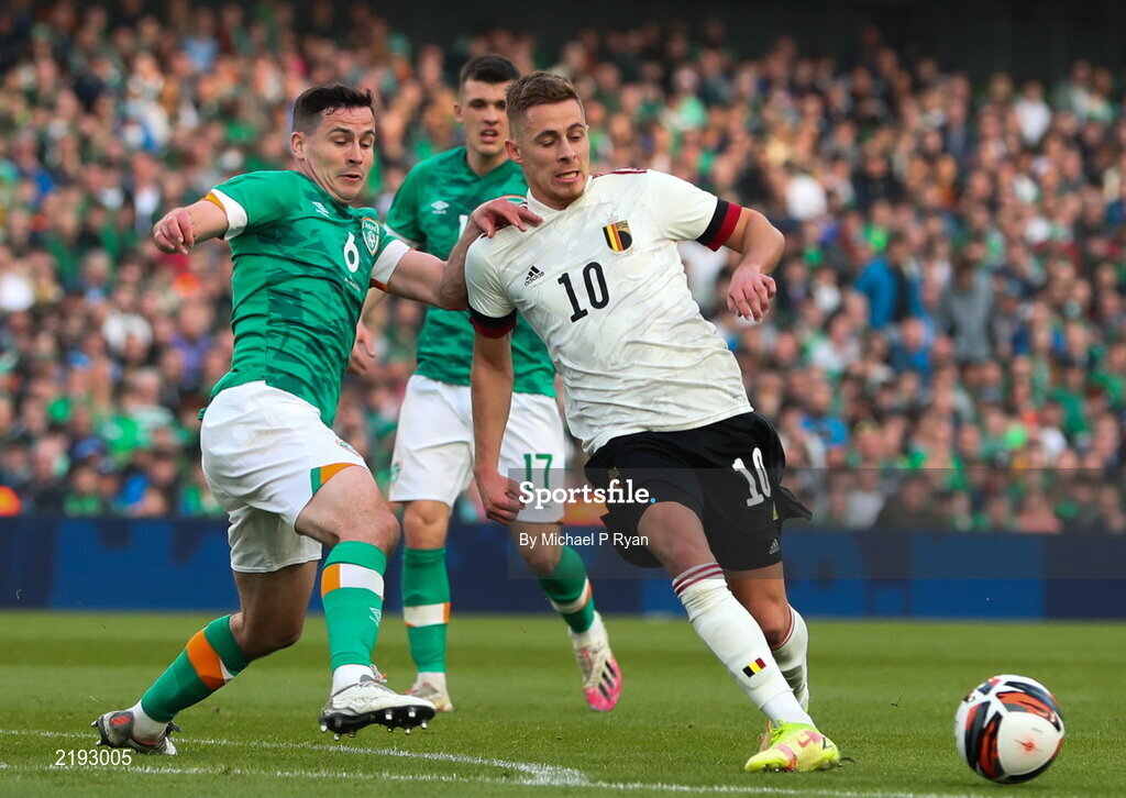 26 March 2022; Thorgan Hazard of Belgium in action against Josh Cullen of Republic of Ireland during the international friendly match between Republic of Ireland and Belgium at the Aviva Stadium in Dublin. Photo by Michael P Ryan/Sportsfile