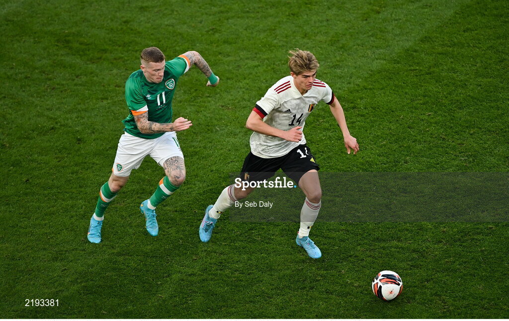 26 March 2022; Charles De Ketelaere of Belgium in action against James McClean of Republic of Ireland during the international friendly match between Republic of Ireland and Belgium at the Aviva Stadium in Dublin. Photo by Seb Daly/Sportsfile