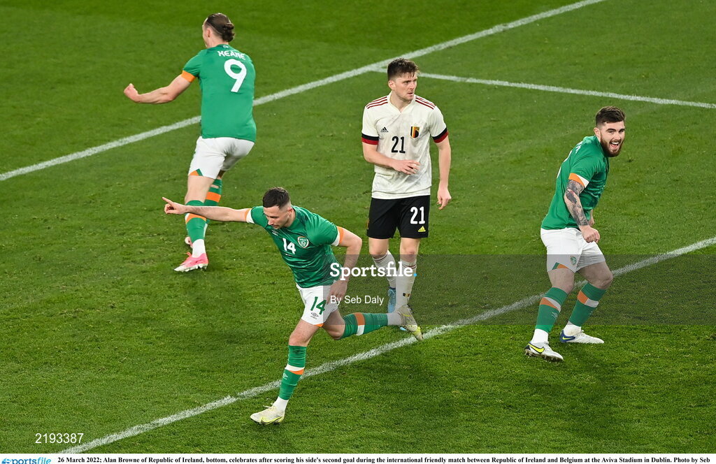 26 March 2022; Alan Browne of Republic of Ireland, bottom, celebrates after scoring his side's second goal during the international friendly match between Republic of Ireland and Belgium at the Aviva Stadium in Dublin. Photo by Seb Daly/Sportsfile