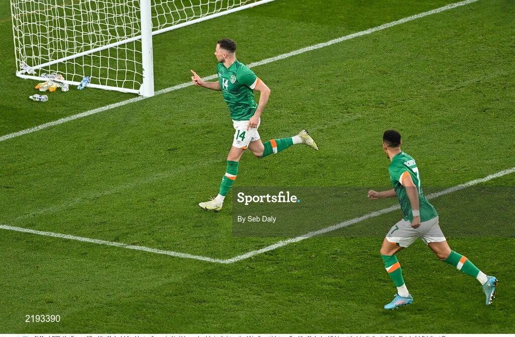 26 March 2022; Alan Browne of Republic of Ireland, left, celebrates after scoring his side's second goal during the international friendly match between Republic of Ireland and Belgium at the Aviva Stadium in Dublin. Photo by Seb Daly/Sportsfile