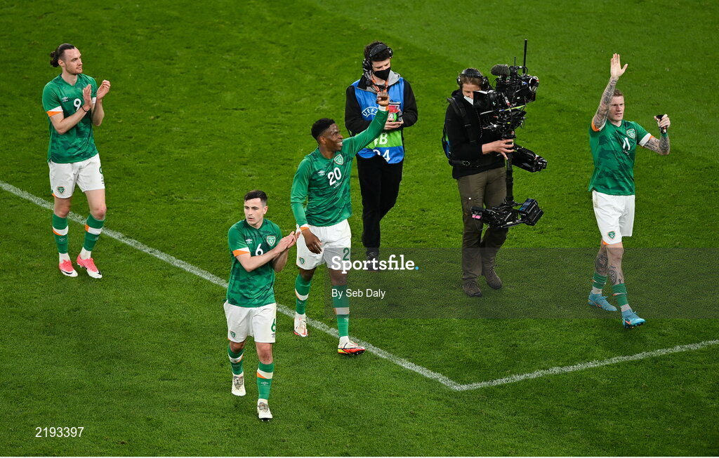 26 March 2022; Republic of Ireland players, from left, Will Keane, Josh Cullen, Chiedozie Ogbene and James McClean after the international friendly match between Republic of Ireland and Belgium at the Aviva Stadium in Dublin. Photo by Seb Daly/Sportsfile