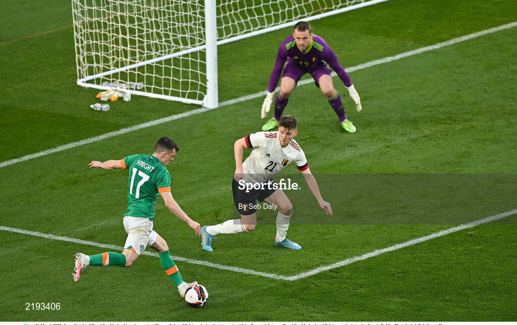 26 March 2022; Jason Knight of Republic of Ireland in action against Thomas Foket of Belgium during the international friendly match between Republic of Ireland and Belgium at the Aviva Stadium in Dublin. Photo by Seb Daly/Sportsfile