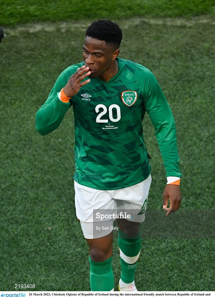 26 March 2022; Chiedozie Ogbene of Republic of Ireland during the international friendly match between Republic of Ireland and Belgium at the Aviva Stadium in Dublin. Photo by Seb Daly/Sportsfile