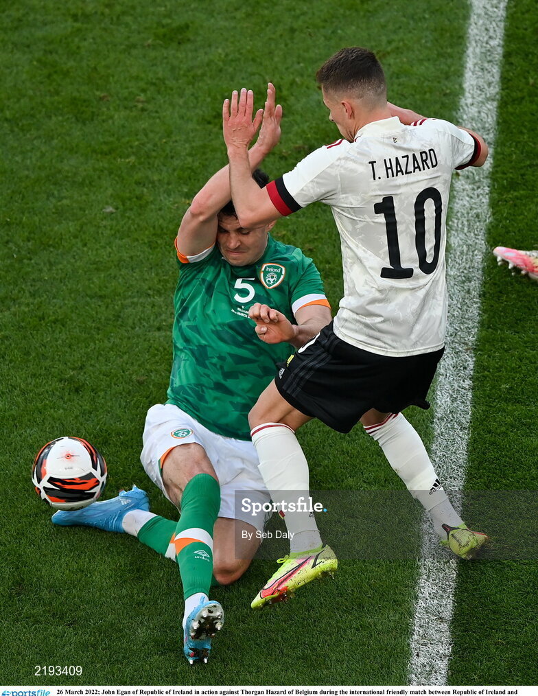 26 March 2022; John Egan of Republic of Ireland in action against Thorgan Hazard of Belgium during the international friendly match between Republic of Ireland and Belgium at the Aviva Stadium in Dublin. Photo by Seb Daly/Sportsfile
