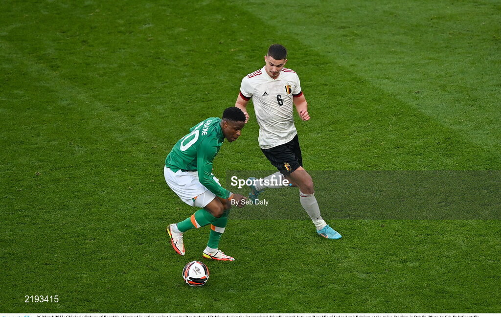 26 March 2022; Chiedozie Ogbene of Republic of Ireland in action against Leander Dendocker of Belgium during the international friendly match between Republic of Ireland and Belgium at the Aviva Stadium in Dublin. Photo by Seb Daly/Sportsfile