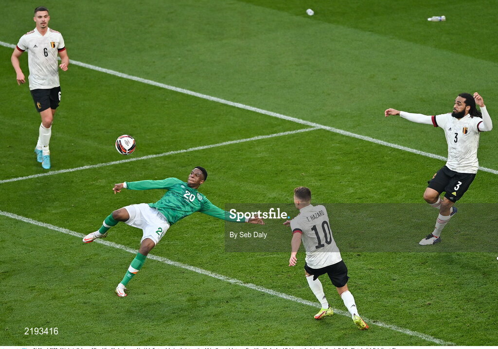 26 March 2022; Chiedozie Ogbene of Republic of Ireland scores his side's first goal during the international friendly match between Republic of Ireland and Belgium at the Aviva Stadium in Dublin. Photo by Seb Daly/Sportsfile