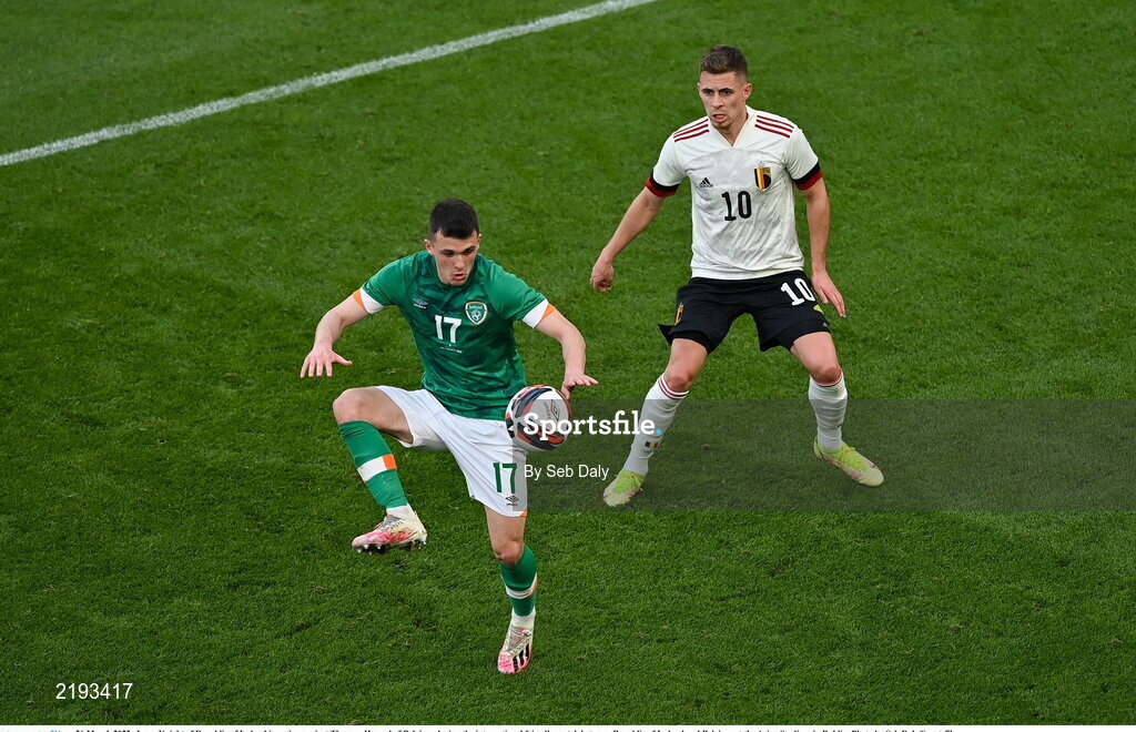 26 March 2022; Jason Knight of Republic of Ireland in action against Thorgan Hazard of Belgium during the international friendly match between Republic of Ireland and Belgium at the Aviva Stadium in Dublin. Photo by Seb Daly/Sportsfile