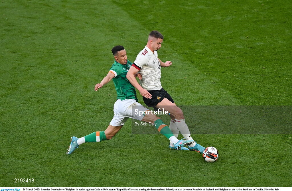 26 March 2022; Leander Dendocker of Belgium in action against Callum Robinson of Republic of Ireland during the international friendly match between Republic of Ireland and Belgium at the Aviva Stadium in Dublin. Photo by Seb Daly/Sportsfile