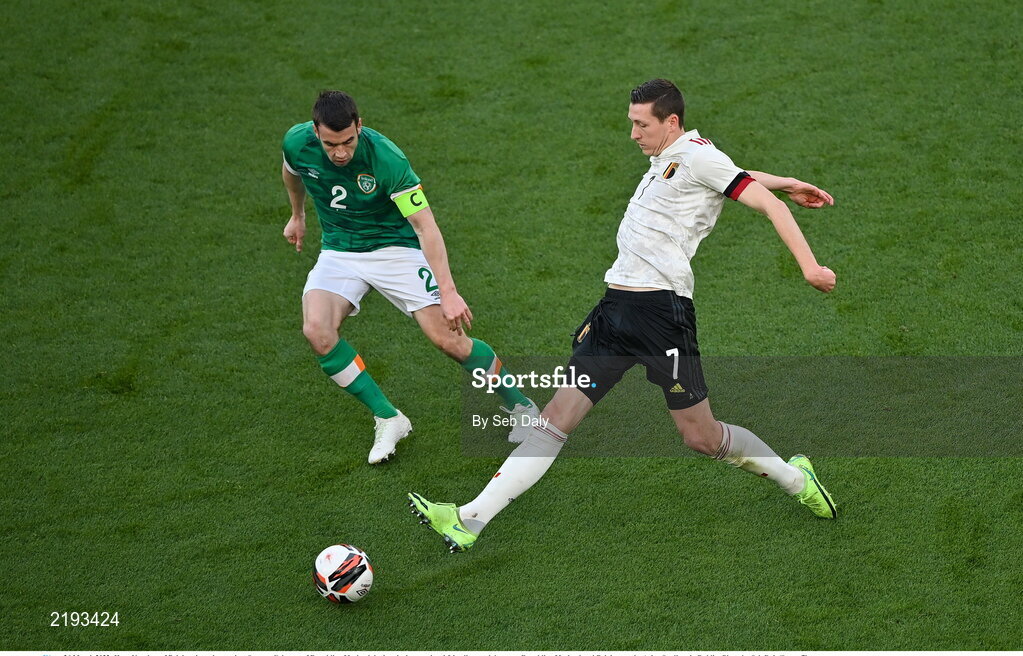 26 March 2022; Hans Vanaken of Belgium in action against Seamus Coleman of Republic of Ireland during the international friendly match between Republic of Ireland and Belgium at the Aviva Stadium in Dublin. Photo by Seb Daly/Sportsfile