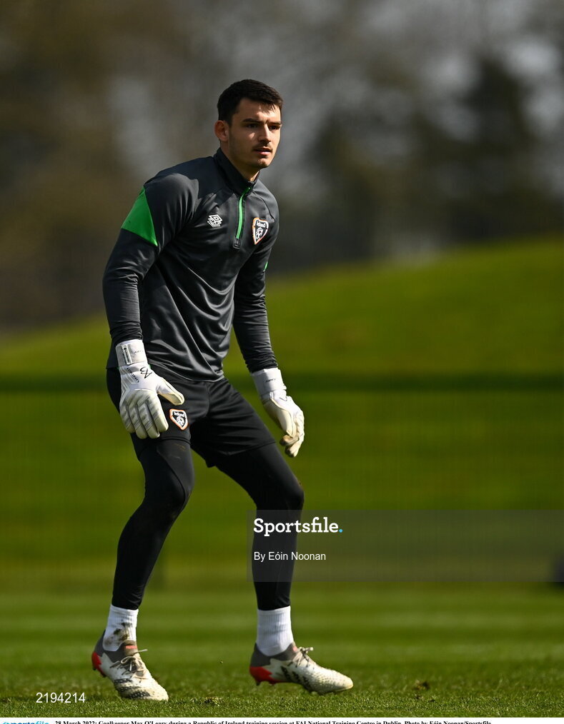 28 March 2022; Goalkeeper Max O'Leary during a Republic of Ireland training session at FAI National Training Centre in Dublin. Photo by Eóin Noonan/Sportsfile