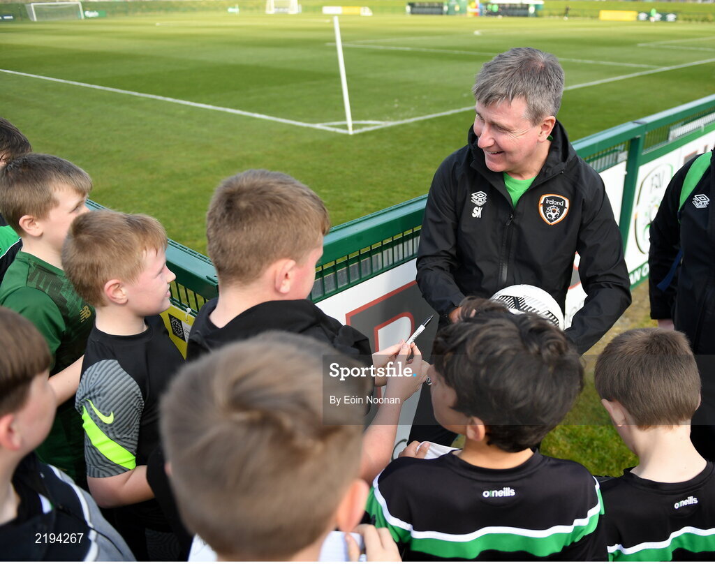 28 March 2022; Manager Stephen Kenny signs autographs for players from Mourne Celtic, Drimnagh, after a Republic of Ireland training session at FAI National Training Centre in Dublin. Photo by Eóin Noonan/Sportsfile