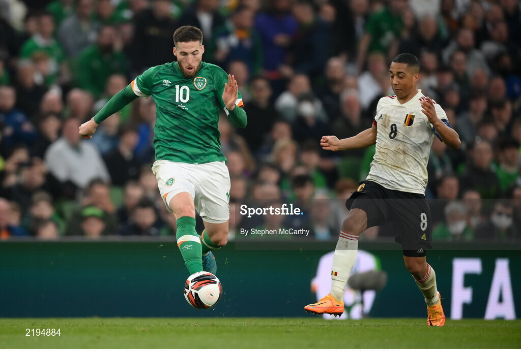 26 March 2022; Matt Doherty of Republic of Ireland in action against Youri Tielemans of Belgium during the international friendly match between Republic of Ireland and Belgium at the Aviva Stadium in Dublin. Photo by Stephen McCarthy/Sportsfile