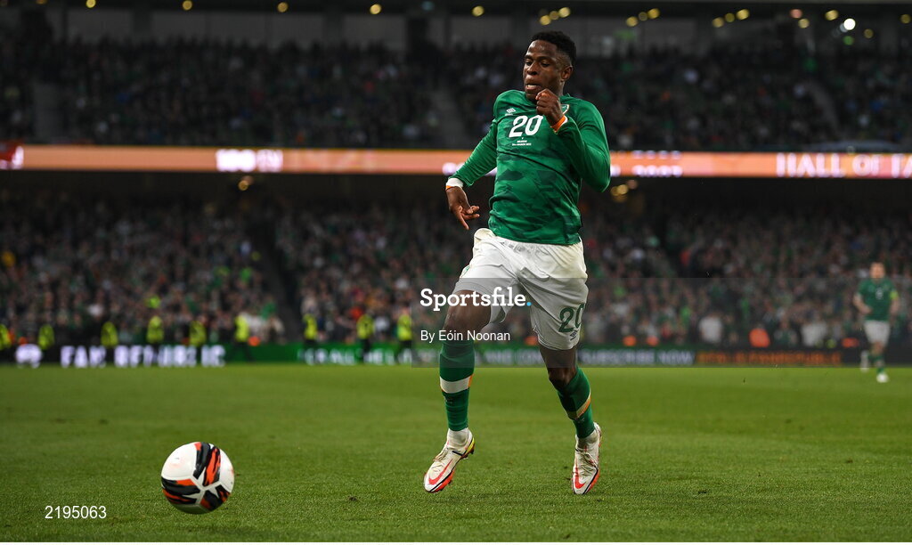 26 March 2022; Chiedozie Ogbene of Republic of Ireland during the international friendly match between Republic of Ireland and Belgium at the Aviva Stadium in Dublin. Photo by Eóin Noonan/Sportsfile