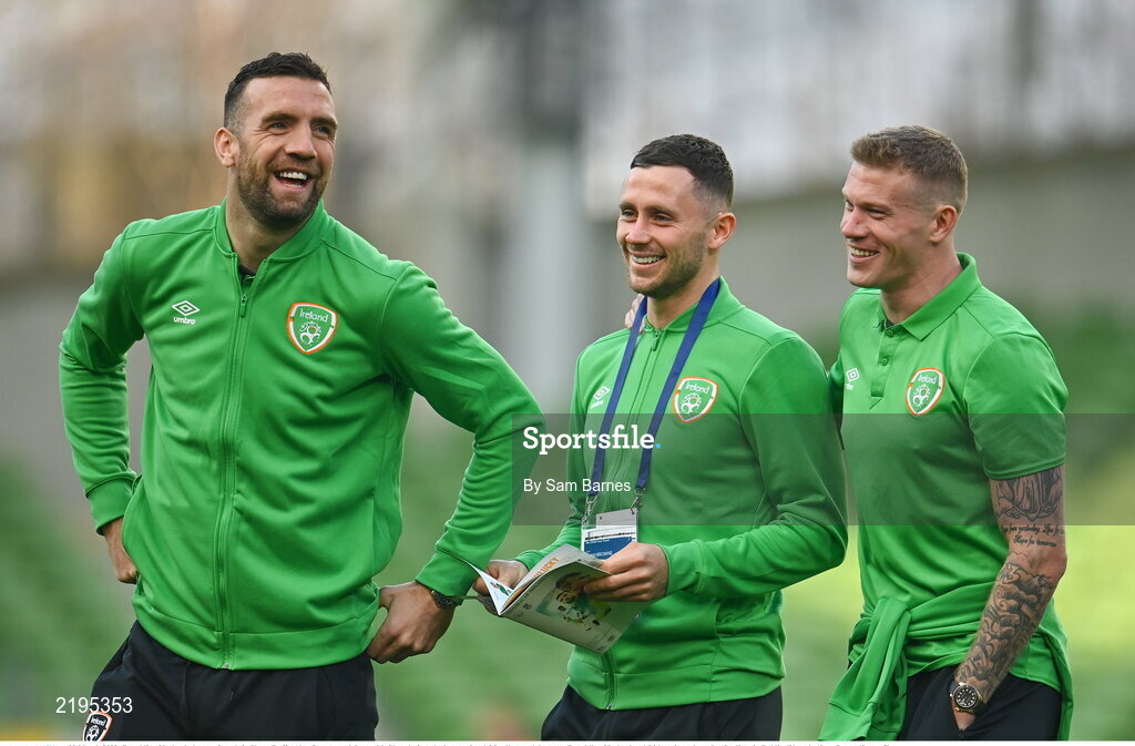 29 March 2022; Republic of Ireland players, from left, Shane Duffy, Alan Browne and James McClean before the international friendly match between Republic of Ireland and Lithuania at the Aviva Stadium in Dublin. Photo by Sam Barnes/Sportsfile