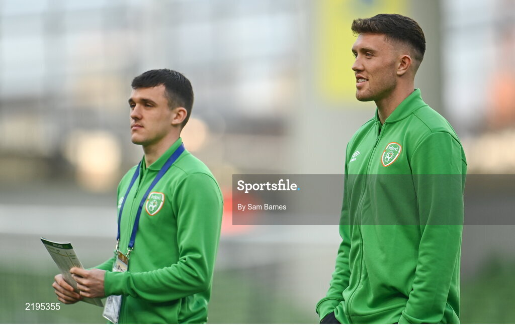 29 March 2022; Dara O'Shea, right, and Jason Knight of Republic of Ireland before the international friendly match between Republic of Ireland and Lithuania at the Aviva Stadium in Dublin. Photo by Sam Barnes/Sportsfile