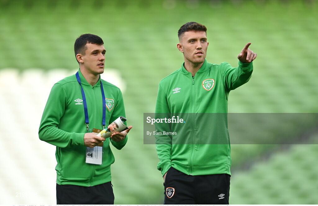 29 March 2022; Dara O'Shea, right, and Jason Knight of Republic of Ireland before the international friendly match between Republic of Ireland and Lithuania at the Aviva Stadium in Dublin. Photo by Sam Barnes/Sportsfile