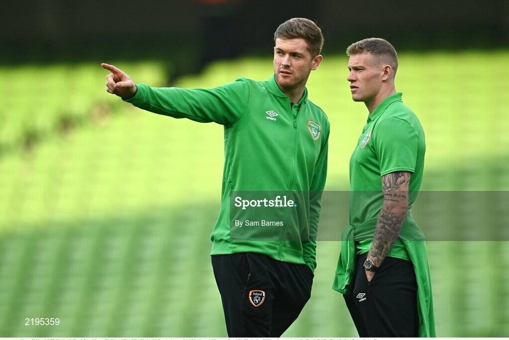 29 March 2022; Nathan Collins, left, and James McClean of Republic of Ireland before the international friendly match between Republic of Ireland and Lithuania at the Aviva Stadium in Dublin. Photo by Sam Barnes/Sportsfile