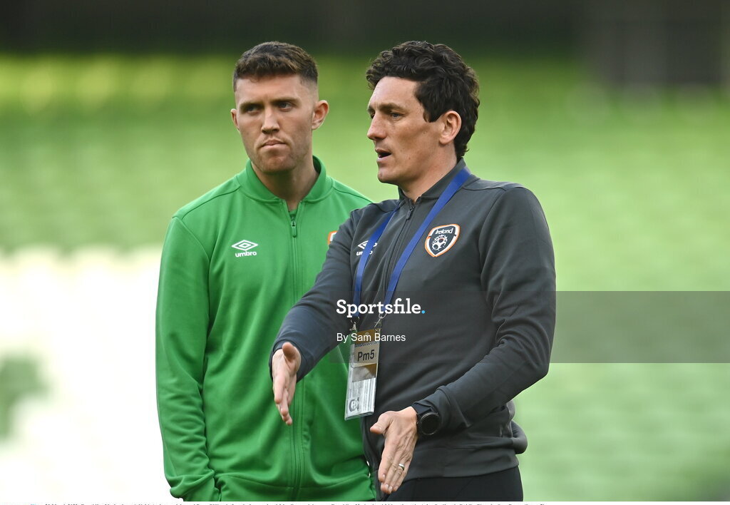29 March 2022; Republic of Ireland coach Keith Andrews, right, and Dara O'Shea before the international friendly match between Republic of Ireland and Lithuania at the Aviva Stadium in Dublin. Photo by Sam Barnes/Sportsfile