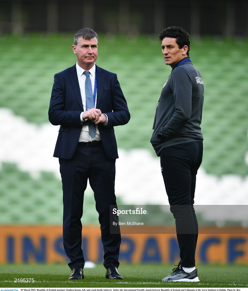 29 March 2022; Republic of Ireland manager Stephen Kenny, left, and coach Keith Andrews before the international friendly match between Republic of Ireland and Lithuania at the Aviva Stadium in Dublin. Photo by Ben McShane/Sportsfile