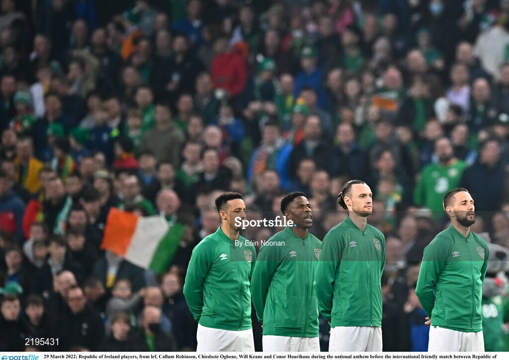 29 March 2022; Republic of Ireland players, from lef, Callum Robinson, Chiedozie Ogbene, Will Keane and Conor Hourihane during the national anthem before the international friendly match between Republic of Ireland and Lithuania at the Aviva Stadium in Dublin. Photo by Eóin Noonan/Sportsfile