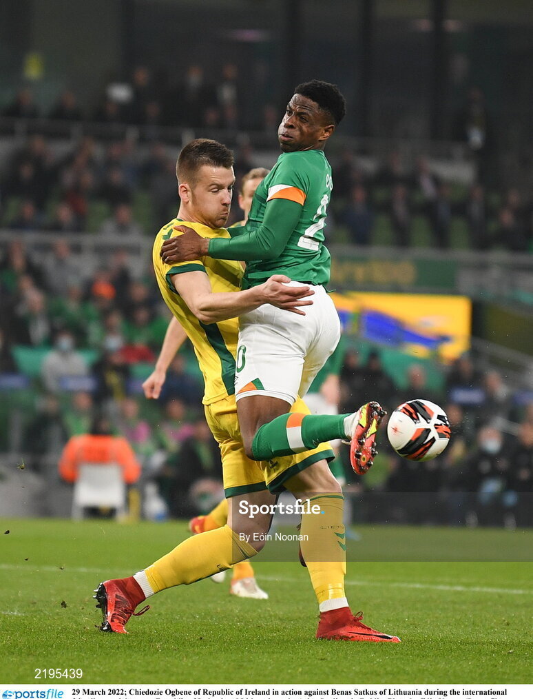 29 March 2022; Chiedozie Ogbene of Republic of Ireland in action against Benas Satkus of Lithuania during the international friendly match between Republic of Ireland and Lithuania at the Aviva Stadium in Dublin. Photo by Eóin Noonan/Sportsfile