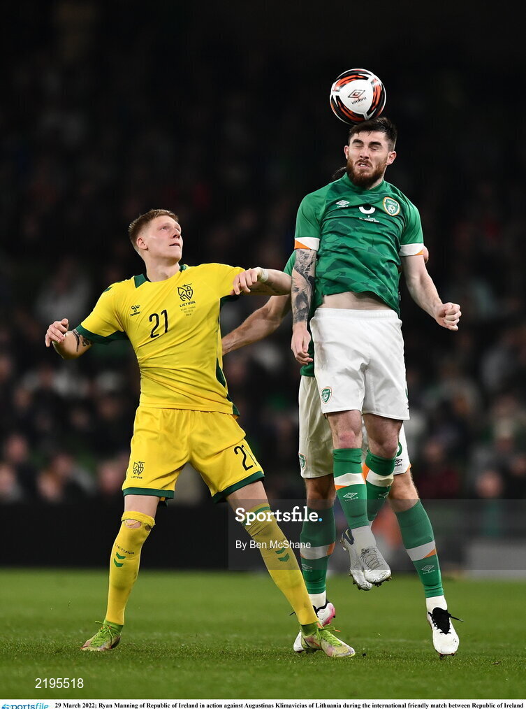 29 March 2022; Ryan Manning of Republic of Ireland in action against Augustinas Klimavicius of Lithuania during the international friendly match between Republic of Ireland and Lithuania at the Aviva Stadium in Dublin. Photo by Ben McShane/Sportsfile