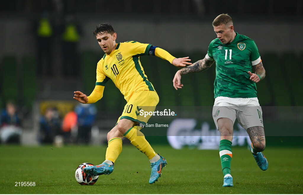 29 March 2022; Fedor Cernych of Lithuania in action against James McClean of Republic of Ireland during the international friendly match between Republic of Ireland and Lithuania at the Aviva Stadium in Dublin. Photo by Sam Barnes/Sportsfile