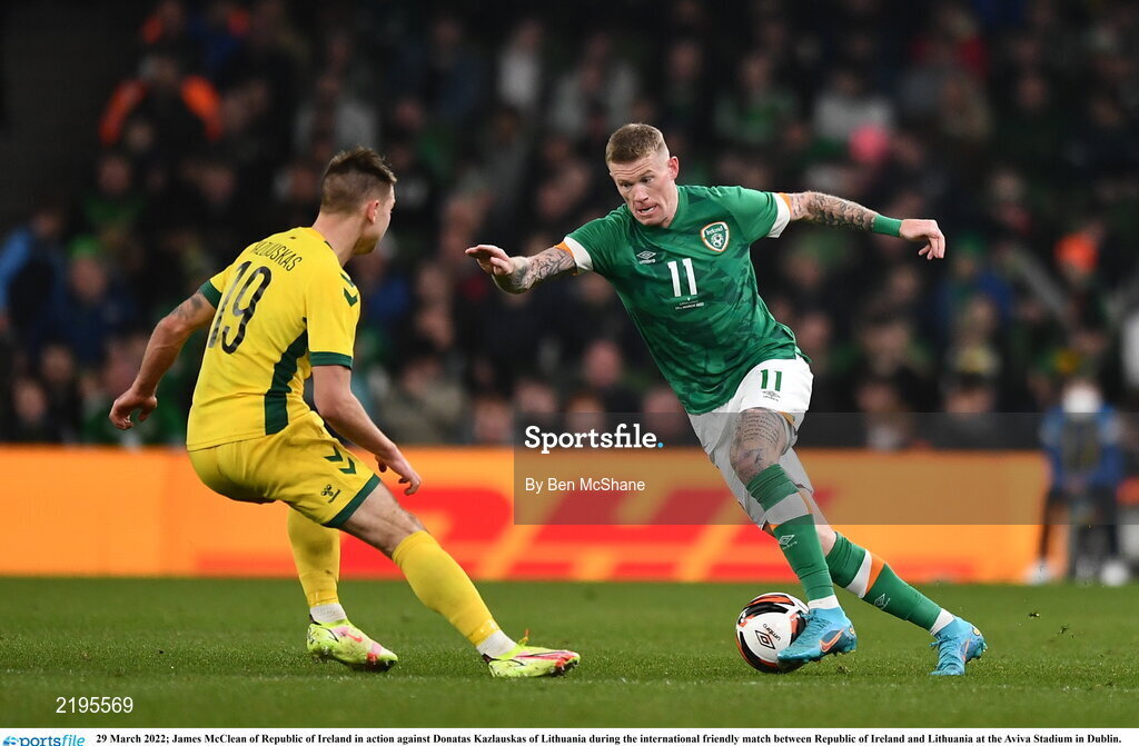 29 March 2022; James McClean of Republic of Ireland in action against Donatas Kazlauskas of Lithuania during the international friendly match between Republic of Ireland and Lithuania at the Aviva Stadium in Dublin. Photo by Ben McShane/Sportsfile