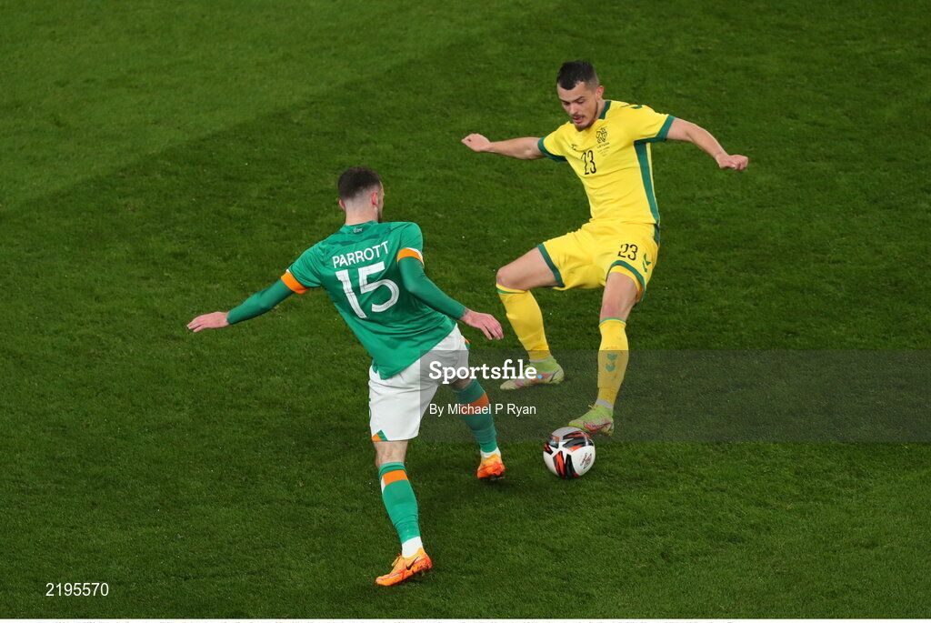 29 March 2022; Rolandas Baravykas of Lithuania in action against Troy Parrott of Republic of Ireland during the international friendly match between Republic of Ireland and Lithuania at the Aviva Stadium in Dublin. Photo by Michael P Ryan/Sportsfile
