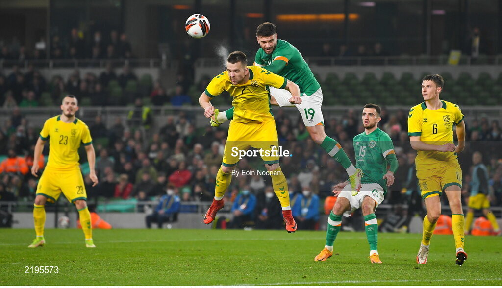 29 March 2022; Linas Klimavicius of Lithuania in action against Scott Hogan of Republic of Ireland during the international friendly match between Republic of Ireland and Lithuania at the Aviva Stadium in Dublin. Photo by Eóin Noonan/Sportsfile