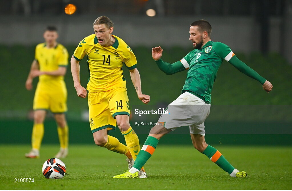 29 March 2022; Conor Hourihane of Republic of Ireland in action against Vykintas Slivka of Lithuania during the international friendly match between Republic of Ireland and Lithuania at the Aviva Stadium in Dublin. Photo by Sam Barnes/Sportsfile