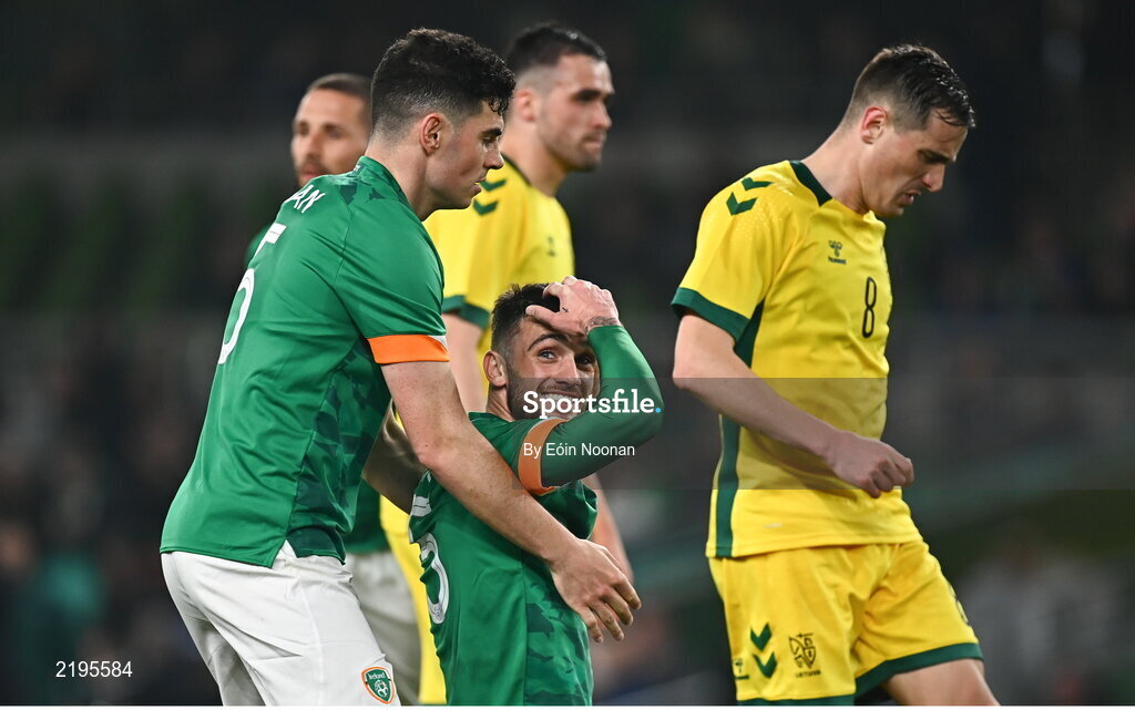 29 March 2022; Troy Parrott, centre, and John Egan of Republic of Ireland during the international friendly match between Republic of Ireland and Lithuania at the Aviva Stadium in Dublin. Photo by Eóin Noonan/Sportsfile