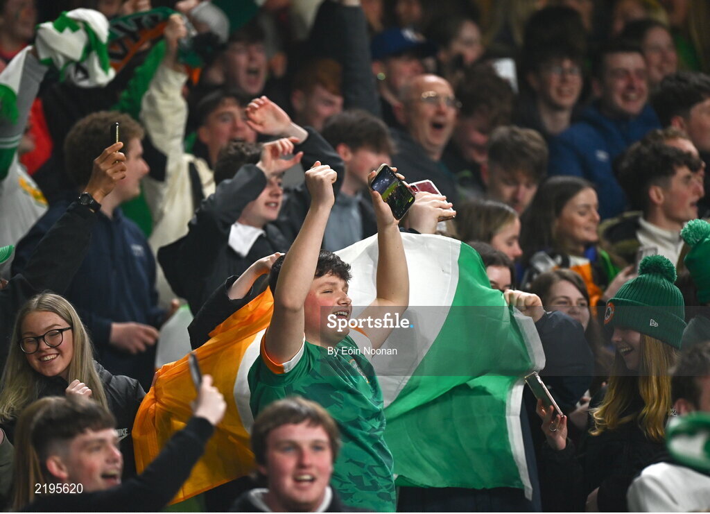 29 March 2022; Republic of Ireland supporters celebrate their side's winning goal during the international friendly match between Republic of Ireland and Lithuania at the Aviva Stadium in Dublin. Photo by Eóin Noonan/Sportsfile