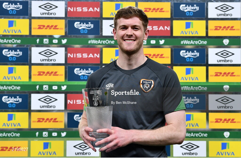 29 March 2022; Nathan Collins of Republic of Ireland with his Player of the Match award after the international friendly match between Republic of Ireland and Lithuania at the Aviva Stadium in Dublin. Photo by Ben McShane/Sportsfile