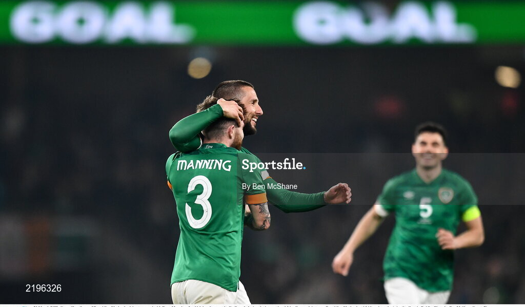 29 March 2022; Conor Hourihane of Republic of Ireland celebrates a goal with Ryan Manning, 3, which is subsequently disallowed, during the international friendly match between Republic of Ireland and Lithuania at the Aviva Stadium in Dublin. Photo by Ben McShane/Sportsfile