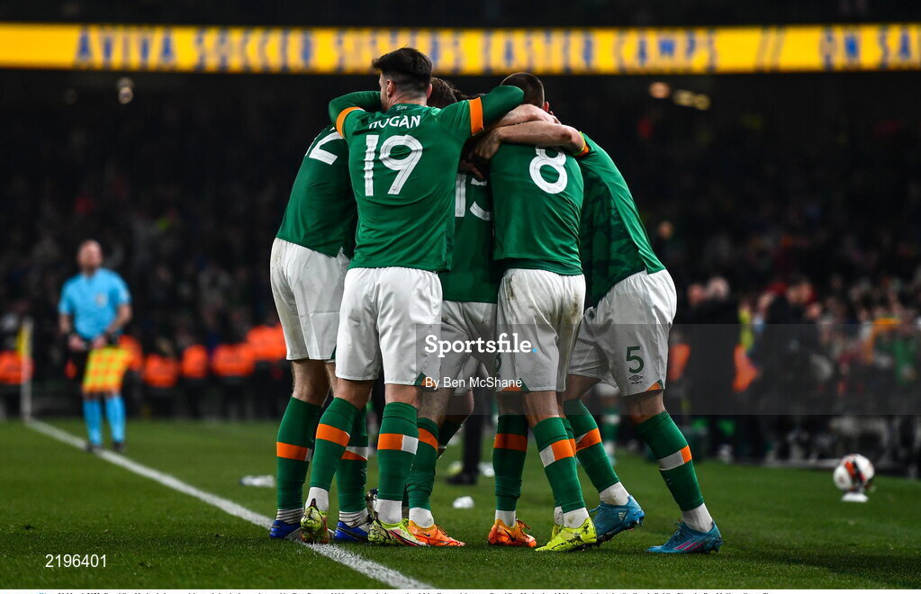 29 March 2022; Republic of Ireland players celebrate their winning goal, scored by Troy Parrott, hidden, during the international friendly match between Republic of Ireland and Lithuania at the Aviva Stadium in Dublin. Photo by Ben McShane/Sportsfile