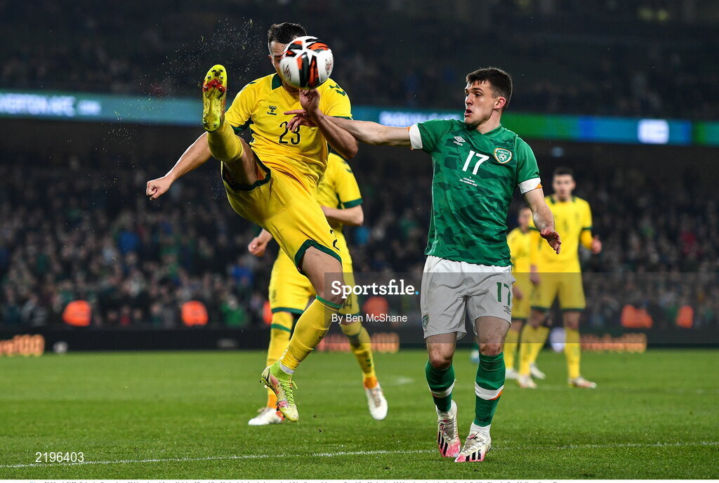29 March 2022; Rolandas Baravykas of Lithuania and Jason Knight of Republic of Ireland during the international friendly match between Republic of Ireland and Lithuania at the Aviva Stadium in Dublin. Photo by Ben McShane/Sportsfile