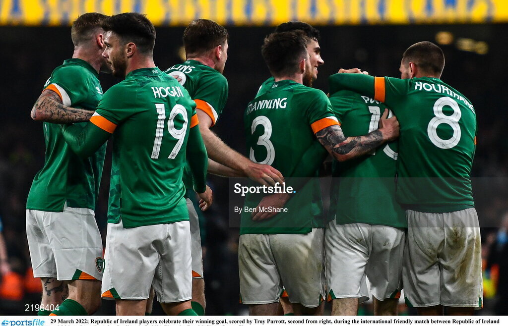 29 March 2022; Republic of Ireland players celebrate their winning goal, scored by Troy Parrott, second from right, during the international friendly match between Republic of Ireland and Lithuania at the Aviva Stadium in Dublin. Photo by Ben McShane/Sportsfile