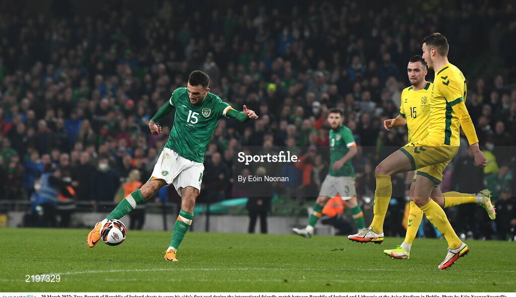 29 March 2022; Troy Parrott of Republic of Ireland shoots to score his side's first goal during the international friendly match between Republic of Ireland and Lithuania at the Aviva Stadium in Dublin. Photo by Eóin Noonan/Sportsfile