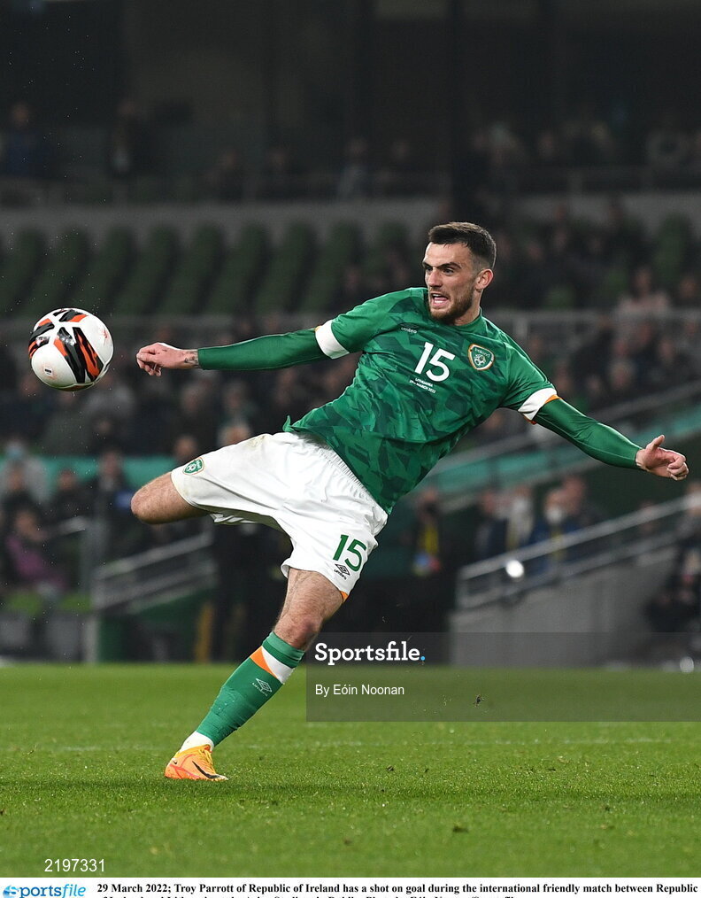 29 March 2022; Troy Parrott of Republic of Ireland has a shot on goal during the international friendly match between Republic of Ireland and Lithuania at the Aviva Stadium in Dublin. Photo by Eóin Noonan/Sportsfile